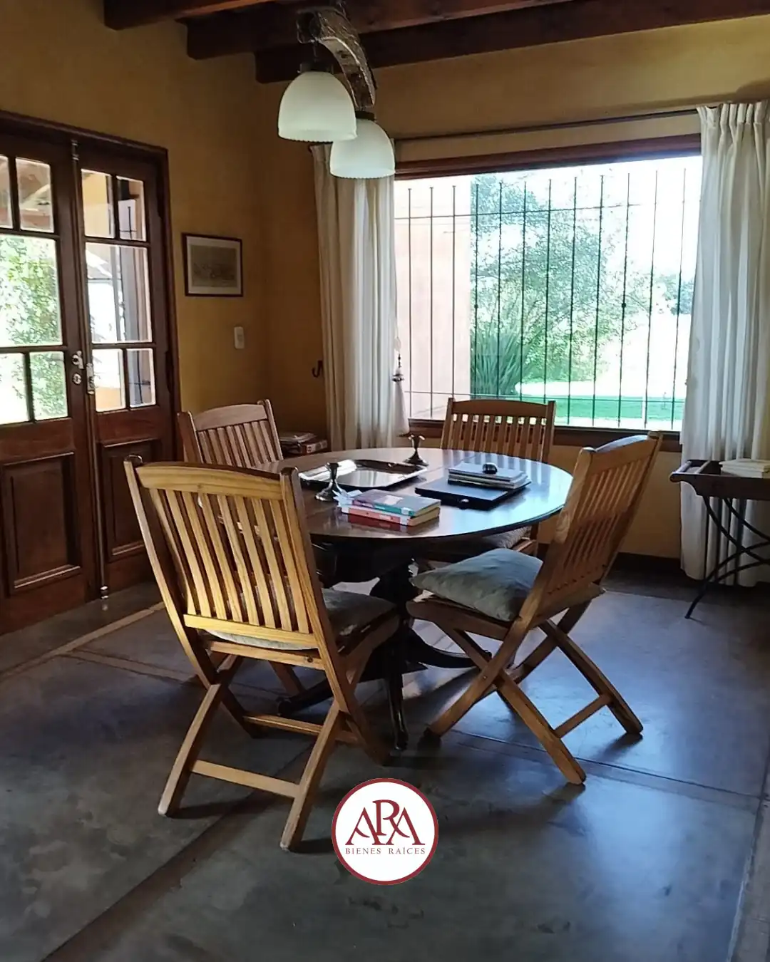 Living con chimenea, toilette y comedor. Integrado si se quiere a la galería semicubierta con parilla.